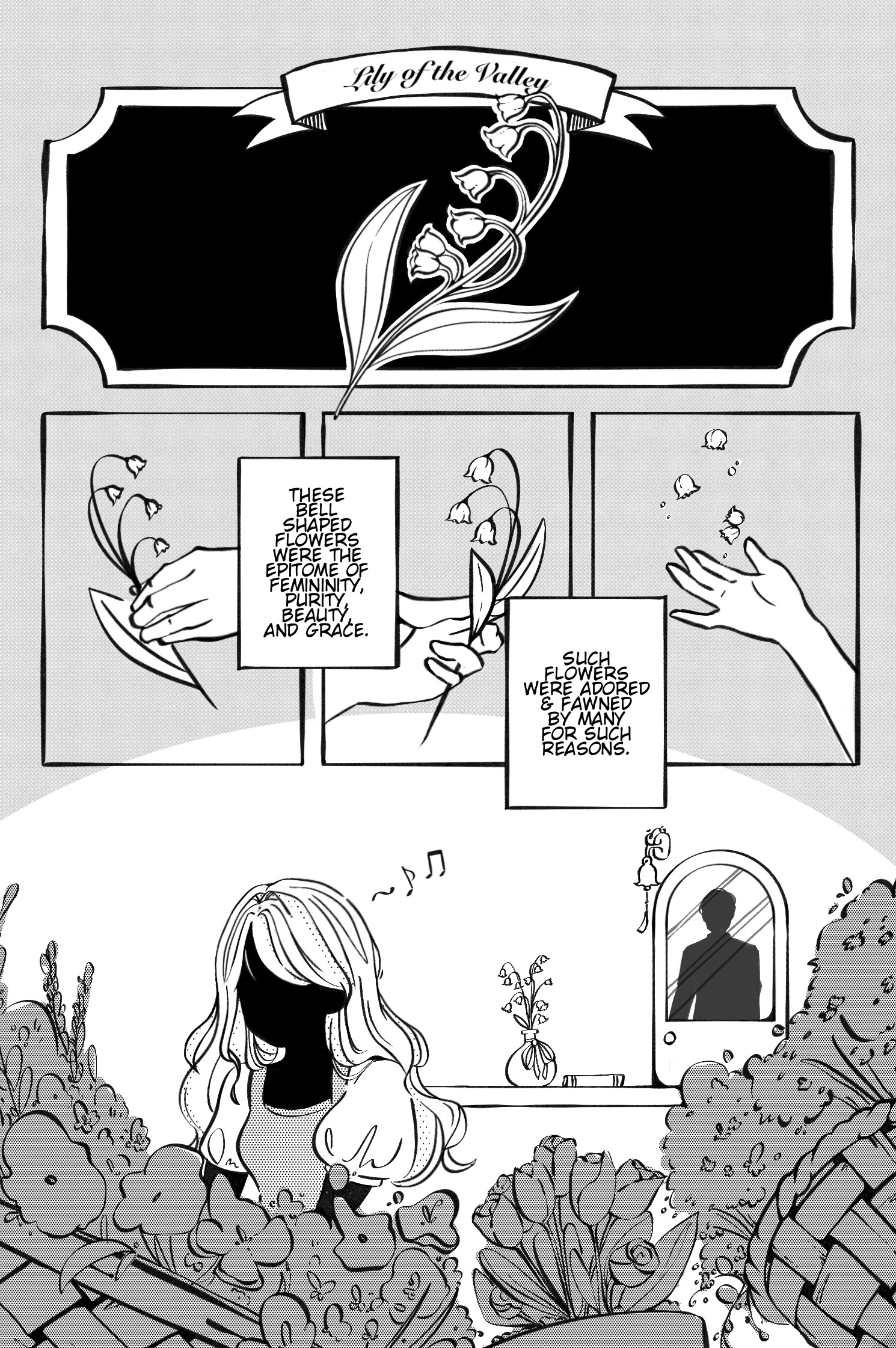 Lilith is a short comic I made in my sequential imagery class spring 2023. The story follows the main character, Lilith, as she runs her flower shop. Just like the Lilith of the Valley, Lilith is the epitome of beauty, feminity, and purity. But as beautiful as she may appear, she has a dark side.